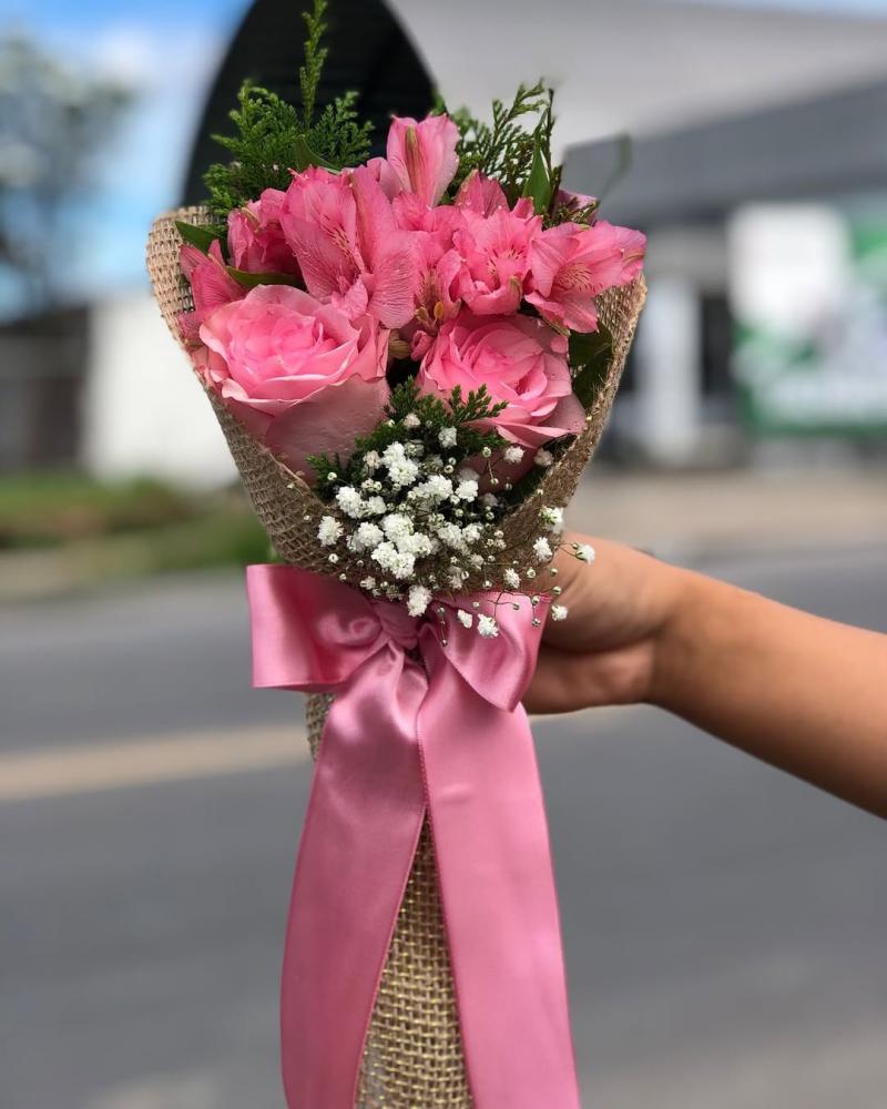 Lindo ramalhete com rosas na cor rosa bebê selecionadas, acompanhadas com astromelias e egypssofila, embalado e um tecido, Um presente delicado e encantador para presentear que ama.