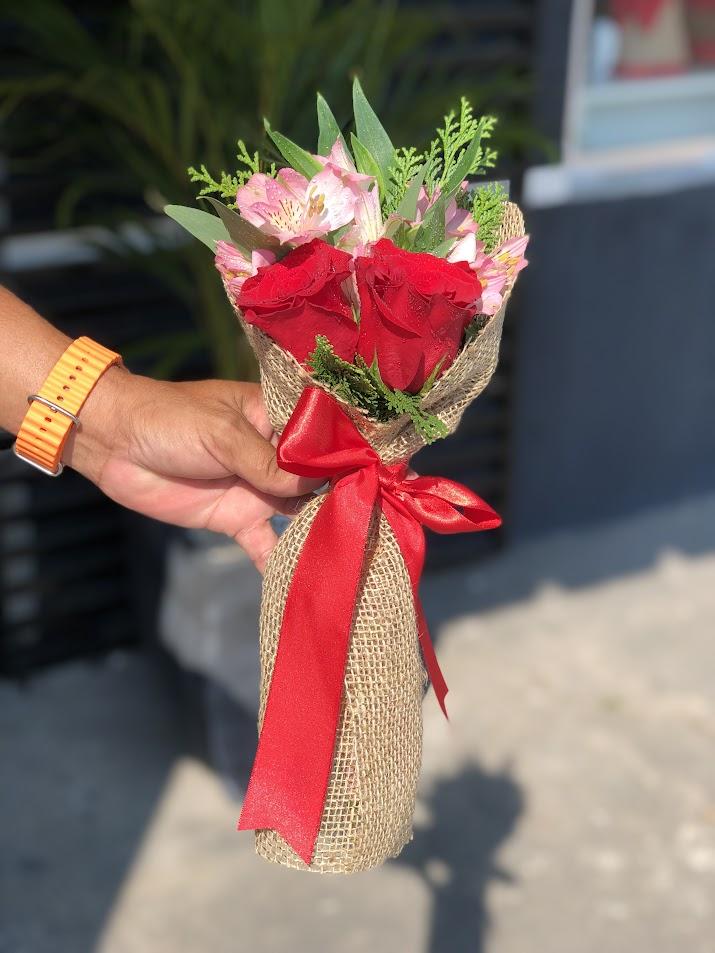 Montado com 2 rosas vermelhas e astromélias, esse mini ramalhete combina delicadeza e charme em um formato compacto. A embalagem em juta com laço vermelho traz um toque rústico e encantador, perfeito para pequenos gestos com grande significado.