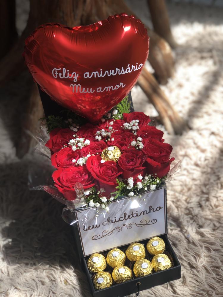 Surpreenda com o nosso Box Luxo Cartonado, um presente sofisticado e encantador. Este box inclui 8 deliciosos Ferrero Rocher, 12 rosas deslumbrantes, um adesivo personalizado e um balão exclusivo, criando uma experiência única e luxuosa. Acompanha também um cartão, perfeito para expressar seus sentimentos de maneira pessoal e inesquecível. Um presente que transmite elegância, amor e carinho, ideal para momentos especiais e inesquecíveis.