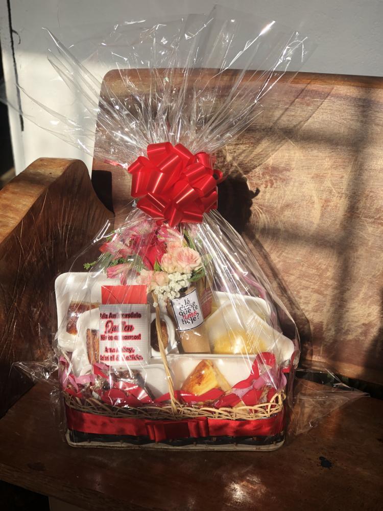 Surpreenda alguém especial com nossa Cesta de Café da Manhã Personalizada, repleta de delícias e carinho. Esta cesta decorada inclui uma caneca personalizada, 1 litro de suco, achocolatado, iogurte e 2 frutas da estação, oferecendo frescor e sabor. Acompanha tapioca simples, tapioca com queijo coalho, cuscuz, banana frita, pães, brioches, presunto e queijo, além de bolo de macaxeira e bolo de chocolate, garantindo uma variedade irresistível para um café da manhã completo. Para finalizar, inclui um cone de flores e um cartão personalizado.