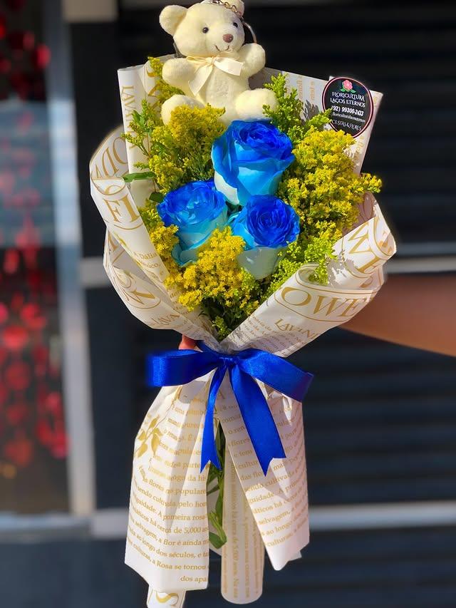 Delicado e cheio de significado, o Buquê Céu de Carinho é montado com 3 rosas azuis, flores do campo e um ursinho de pelúcia para completar o gesto com ternura.