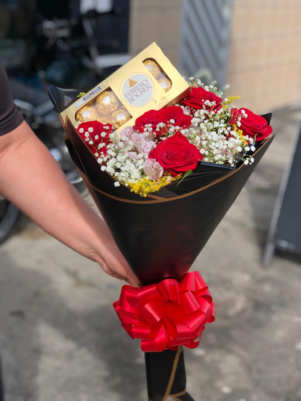 Surpreenda com a elegância do Buquê Amor Clássico, composto por 6 deslumbrantes rosas vermelhas, símbolo eterno de paixão e romance. Acompanha uma caixa de chocolates Ferrero Rocher, perfeita para adoçar o momento. A combinação é apresentada em uma embalagem preta sofisticada, finalizada com um laço delicado, transmitindo charme e intensidade.