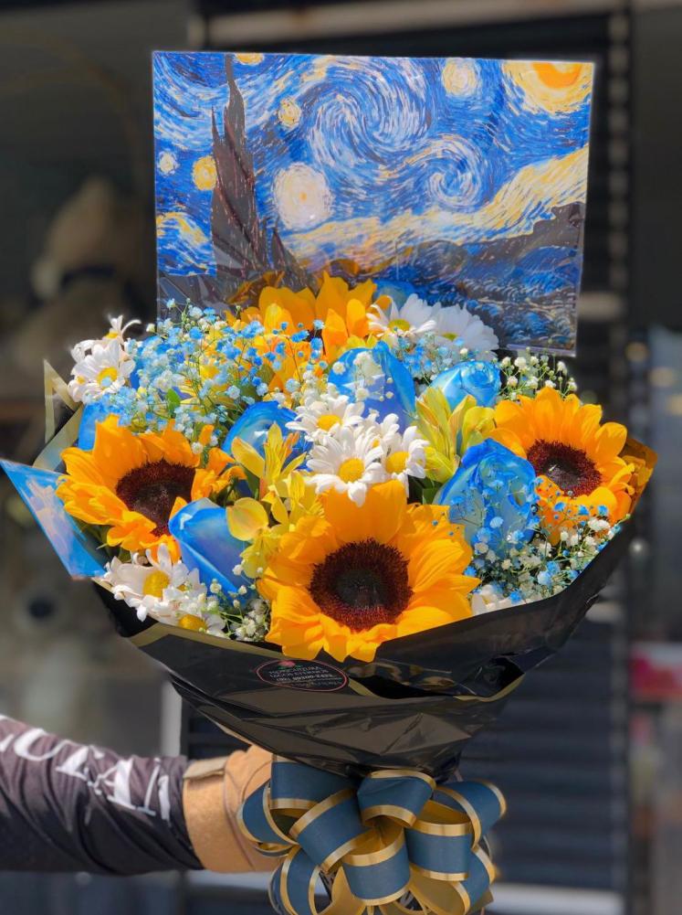 Surpreenda com um presente verdadeiramente único: nosso buquê exclusivo com rosas azuis, um delicado mix de flores e girsassóis vibrantes, inspirado na icônica obra “Noite Estrelada” de Van Gogh. Mais do que um arranjo floral, este buquê é uma expressão de arte viva, que traduz em flores a beleza, a emoção e a magia das estrelas.