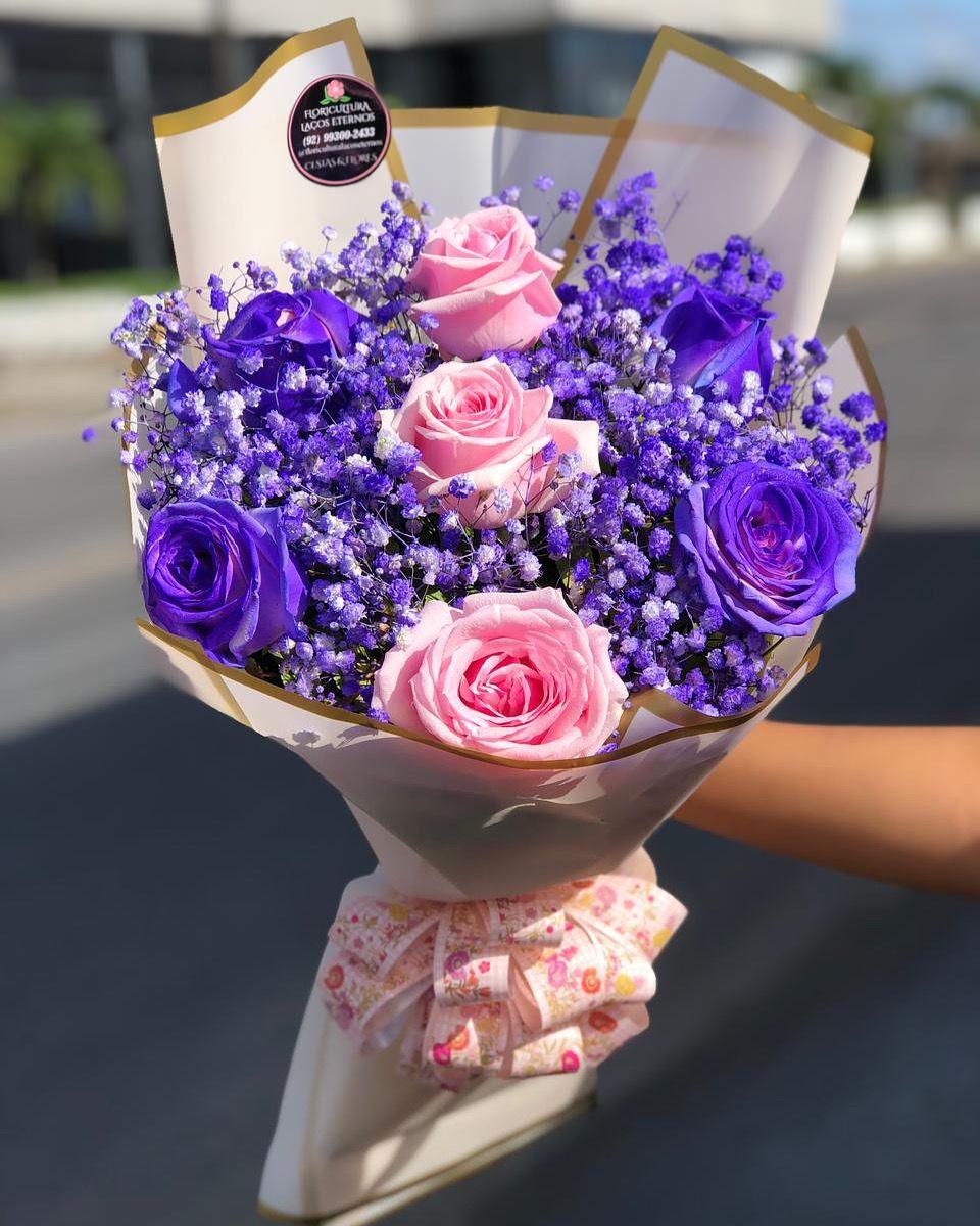 Delicadeza em forma de flores! O Buquê Valentine's Day é montado por 3 rosas na suave cor rosa bebê e 4 rosas em tons lilás, criando uma combinação romântica e harmoniosa. As gypsophilas tingidas de lilás trazem um toque especial ao arranjo, envolto em uma embalagem branca com detalhes em rosa, que valoriza ainda mais a beleza das flores.
