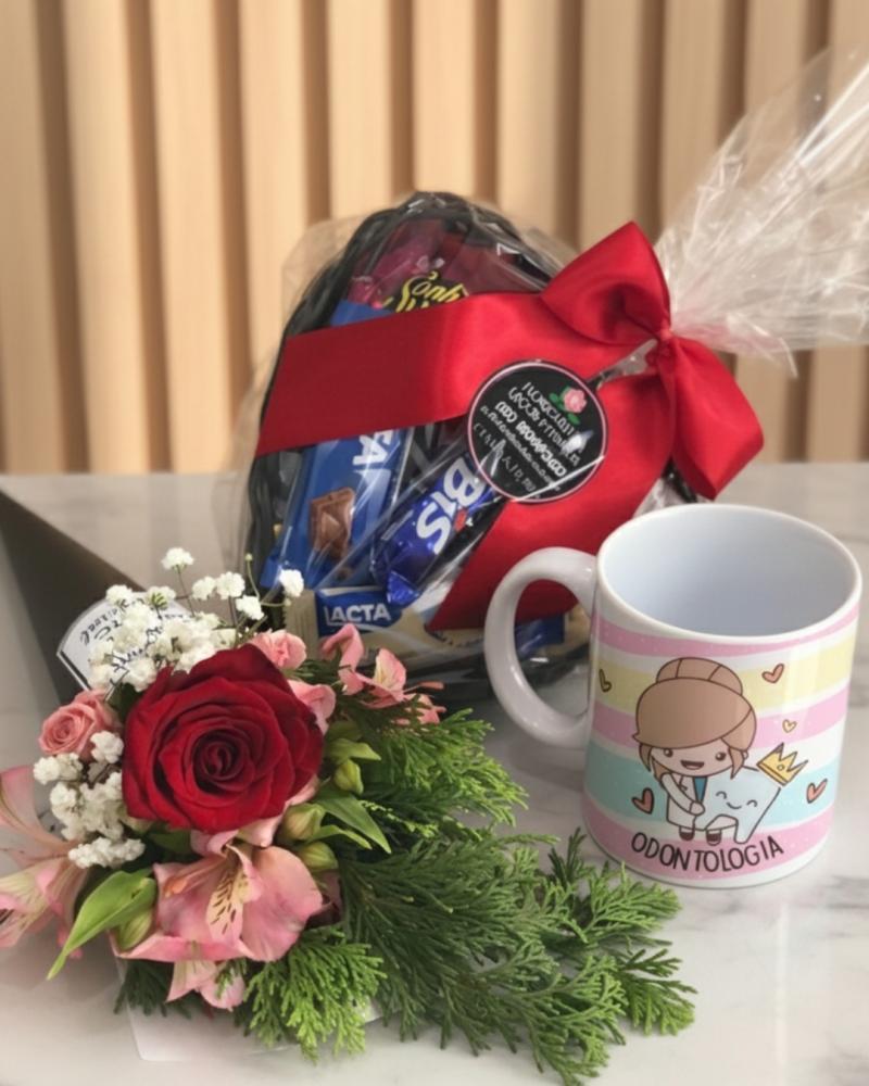 Um presente encantador para presentear com delicadeza e carinho. O kit é composto por um cone de flores com uma rosa, mini-rosas e astromélias, acompanhado de uma cesta com chocolates sortidos e uma caneca personalizada com nome e tema floral.