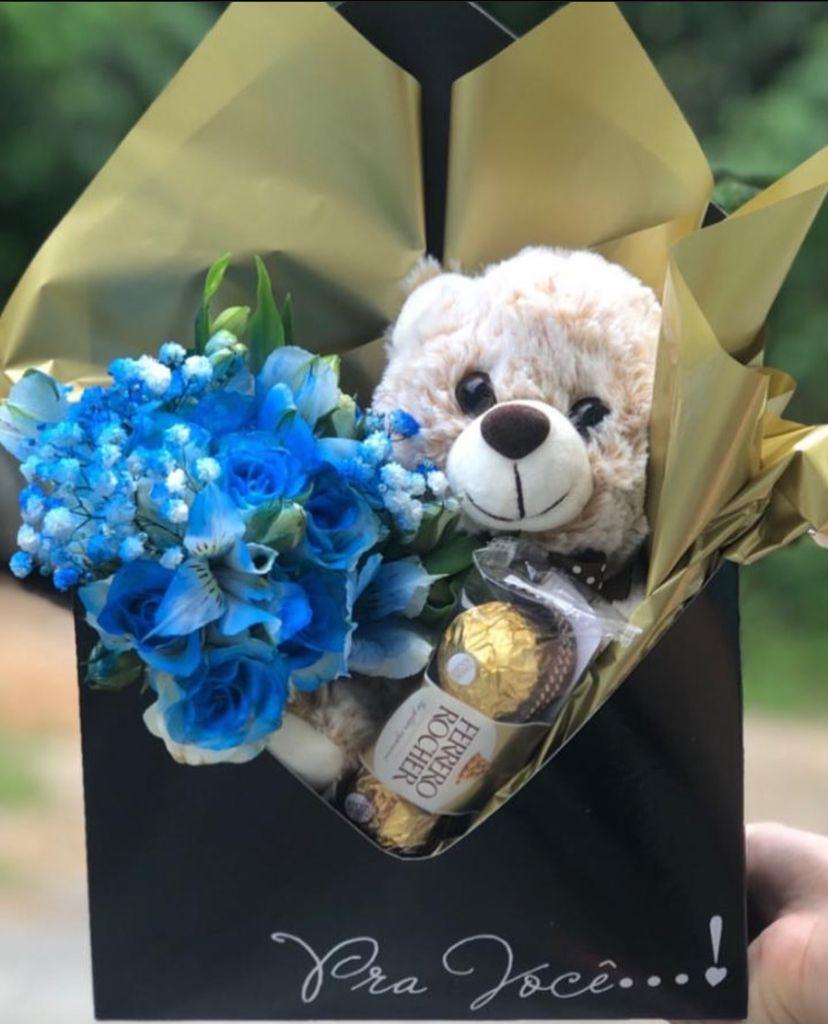 Encante com nossa charmosa box cartonada em formato de envelope, que traz um delicado arranjo mine flores em tons azuis, simbolizando alegria, ternura e afeto. Para tornar o presente ainda mais especial, ela acompanha uma pelúcia de 10 cm super fofa, um trio de chocolates Ferrero Rocher irresistíveis e um cartão personalizado com a sua mensagem.