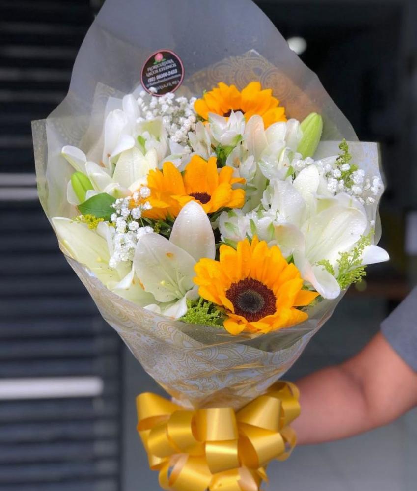 Um buquê delicado e iluminado, que transmite alegria, carinho e boas energias. Composto por girassóis vibrantes, flores brancas selecionadas e folhagens leves, é finalizado com embalagem sofisticada e laço em tom dourado, trazendo um toque de elegância ao presente.