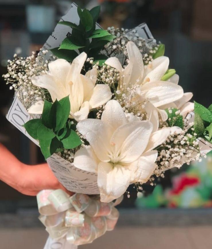 Um buquê delicado e encantador, composto por lírios brancos, flores miúdas e folhagens verdes, envolvido em embalagem charmosa que valoriza ainda mais sua beleza natural.