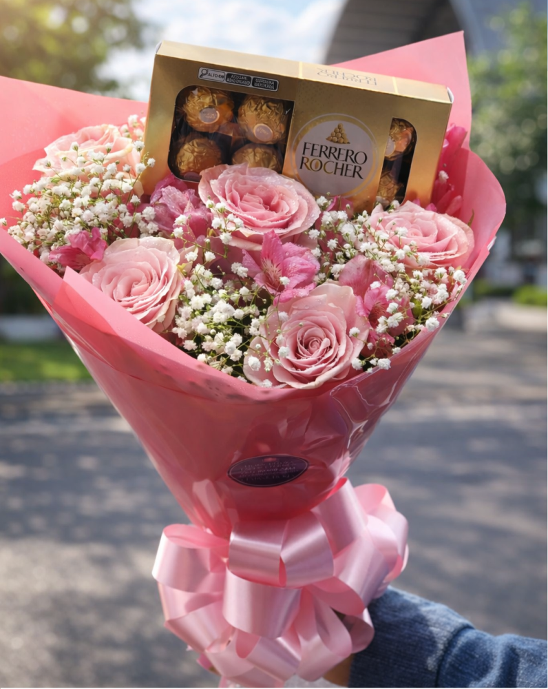 Um buquê delicado e apaixonante, montado com 6 rosas cor de rosa bebê, astromélias e acabamento em gypsophila, formando uma composição leve, romântica e elegante. Acompanha uma caixa de chocolate ao leite com recheio cremoso de avelã, Ferrero Rocher 100g (T8), perfeito para deixar a surpresa ainda mais doce. Ideal para aniversários, declarações ou simplesmente para demonstrar carinho, e ainda acompanha um cartão para mensagem personalizada, tornando o gesto ainda mais especial.