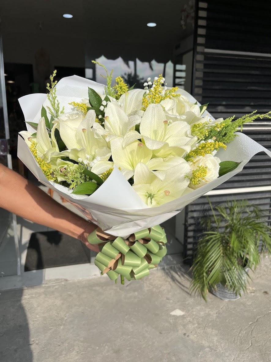 Um buquê sofisticado e atemporal, composto por lírios brancos frescos, folhagens selecionadas e delicados detalhes florais. Sua composição transmite pureza, serenidade e elegância, ideal para momentos especiais e cheios de significado.