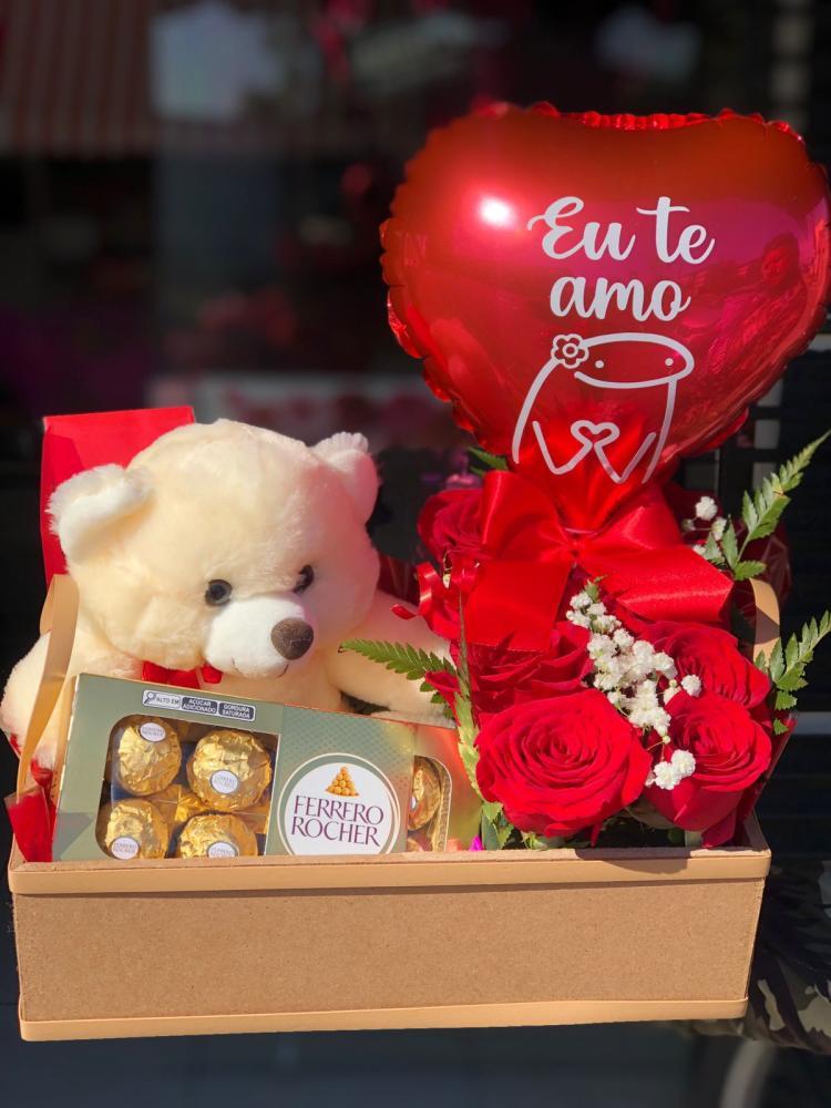 Encante quem você ama com o nosso Kit Eu Te Amo, uma cesta charmosa e repleta de surpresas especiais. Com um arranjo de 4 rosas deslumbrantes, um balão bubble personalizado, um adorável urso de pelúcia e deliciosos chocolates Ferrero Rocher, este presente é a expressão perfeita de carinho e afeto. Acompanha um cartão personalizado, para que você possa transmitir seus sentimentos de forma única e inesquecível. Um presente completo, ideal para surpreender e alegrar o coração de quem você ama.