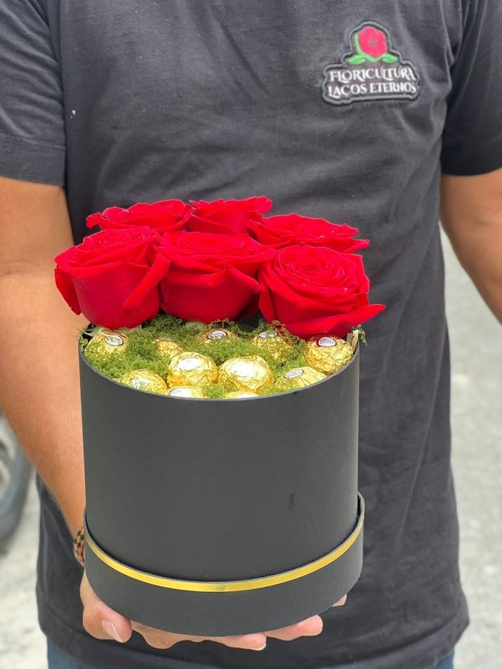 Um presente luxuoso que une elegância e indulgência. A Gift BoxGold traz um arranjo impecável com 06 rosas colombianas vermelhas selecionadas, harmonizadas com deliciosos chocolates Ferrero Rocher, envoltos por um acabamento sofisticado em caixa rígida premium.
